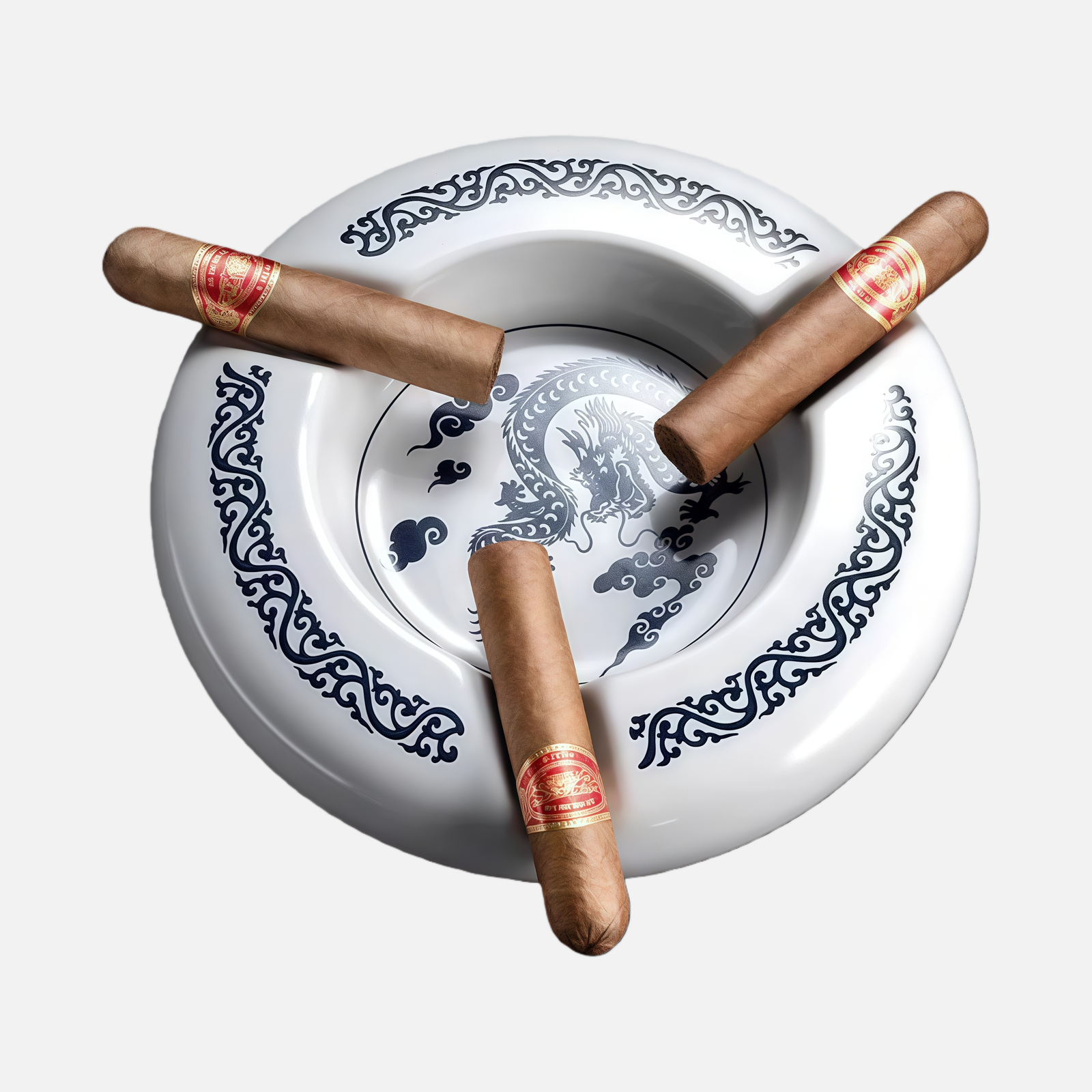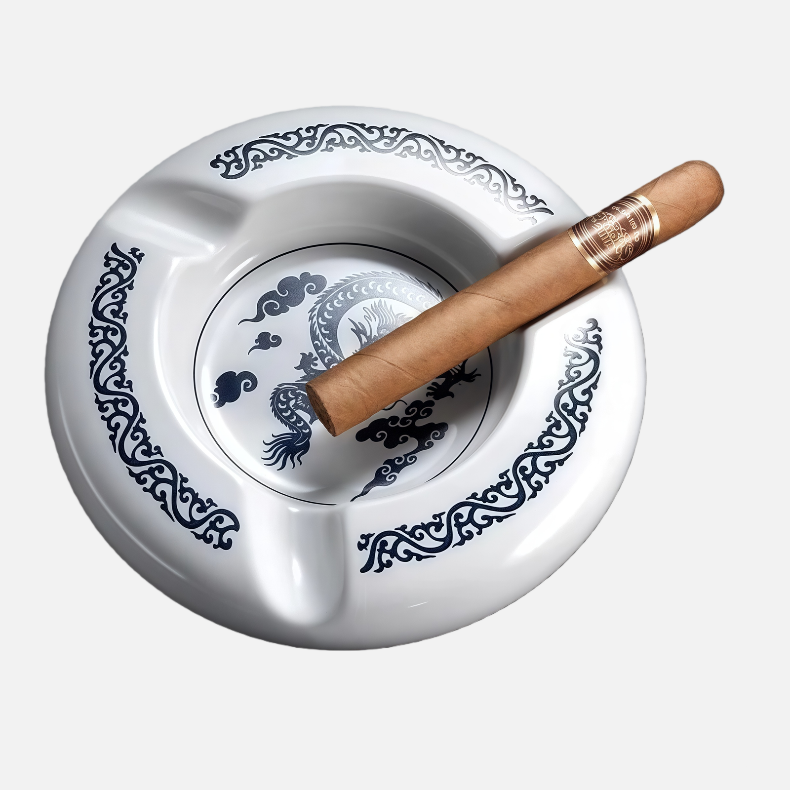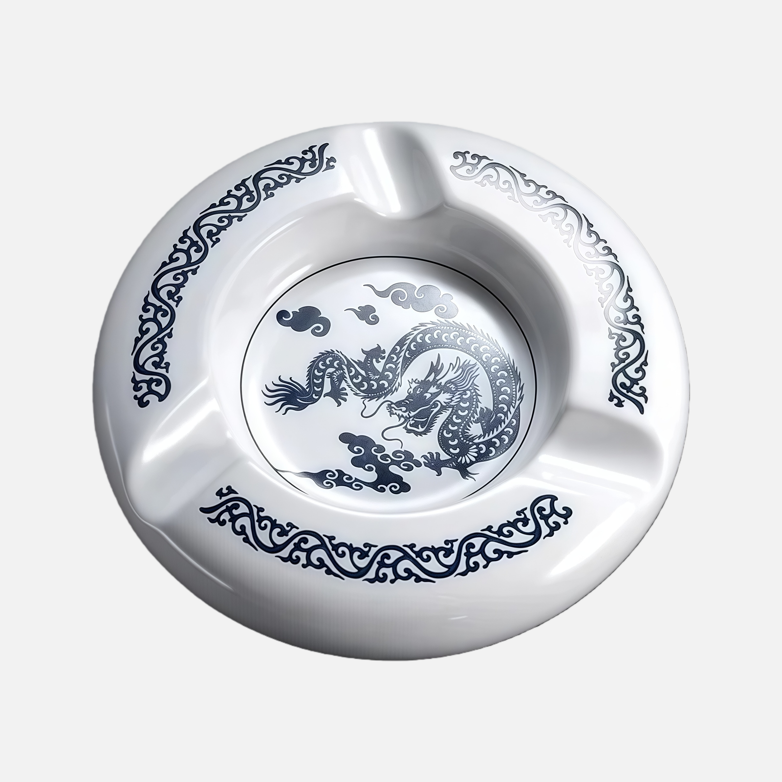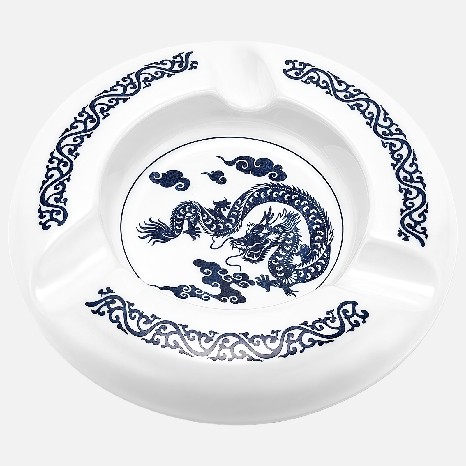 This ceramic cigar ashtray features a classic blue-and-white Chinese dragon design, combining traditional oriental aesthetics with practical everyday use. Designed for cigar lovers, it adds a refined decorative touch to desks, lounges, and personal spaces.