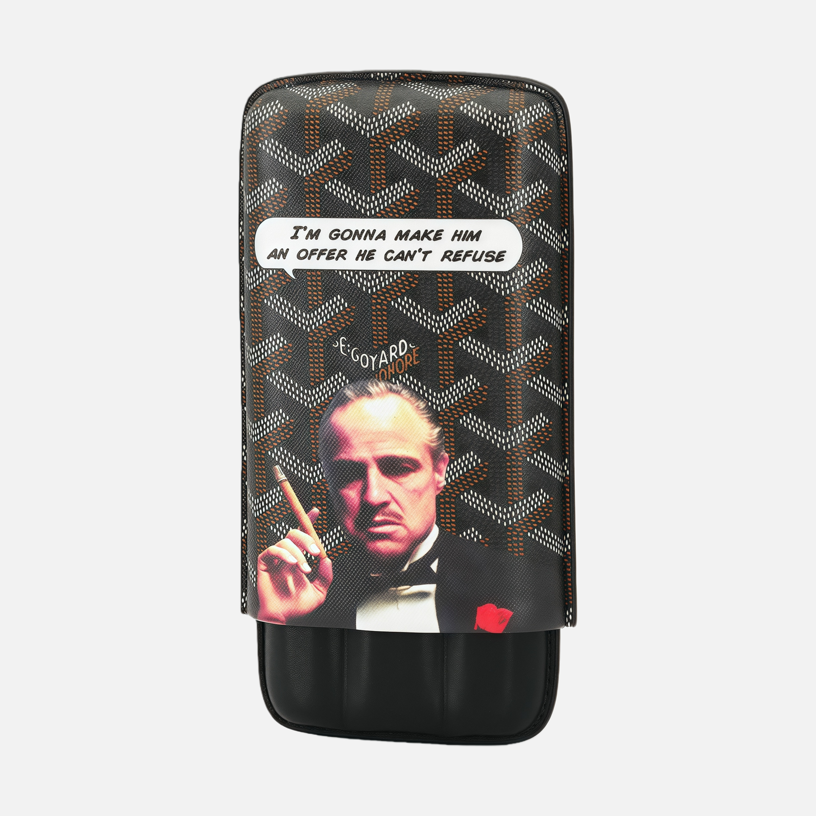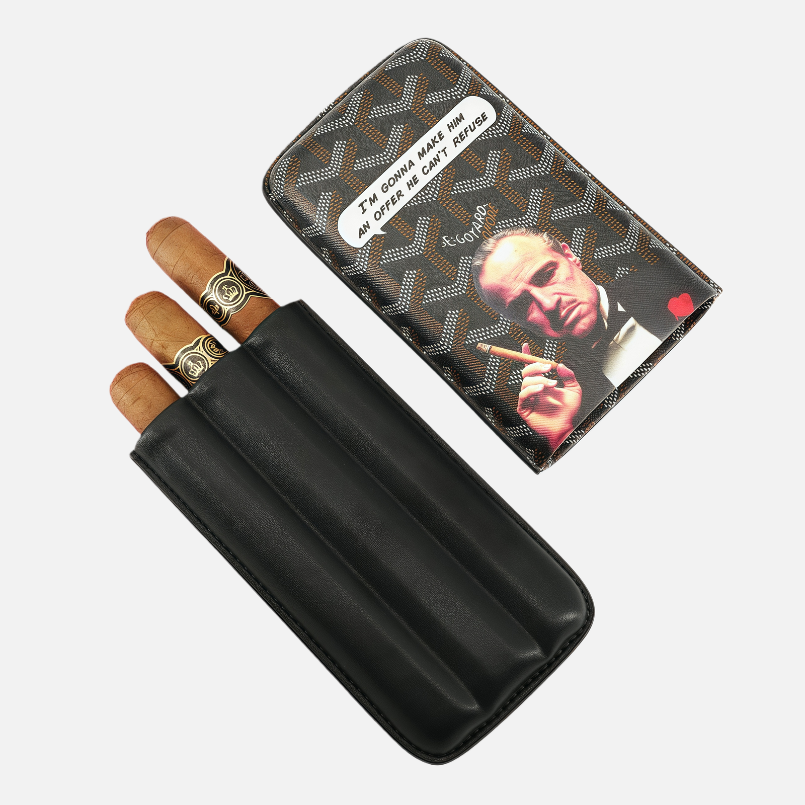 Crafted from premium leather, the case offers a smooth, structured feel with excellent durability. The classic Godfather-inspired print is subtle yet powerful, symbolizing confidence, authority, and timeless style. Designed to hold three cigars securely, the interior layout protects against pressure and movement during travel.