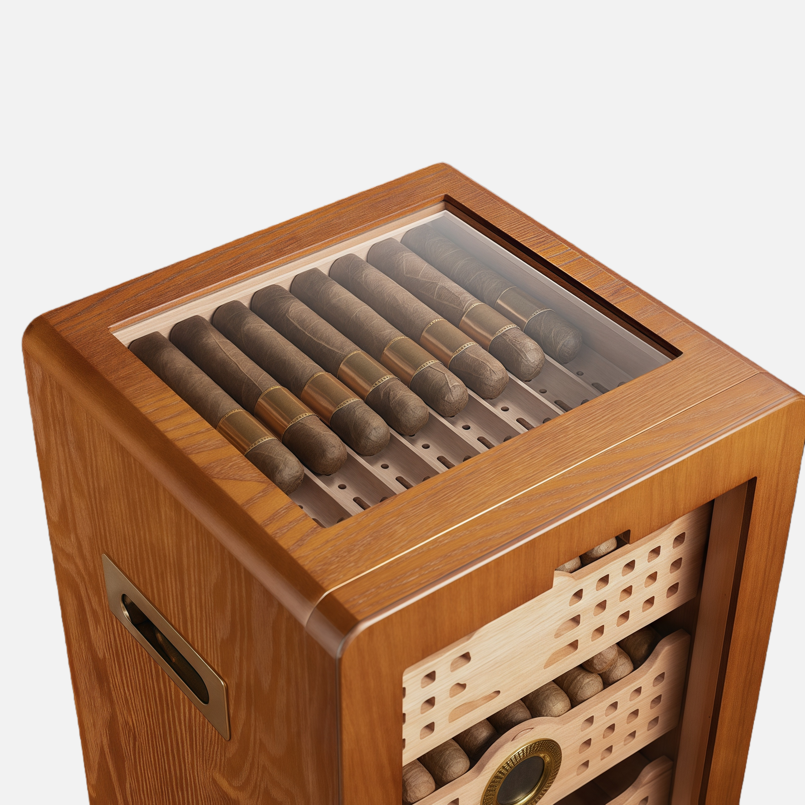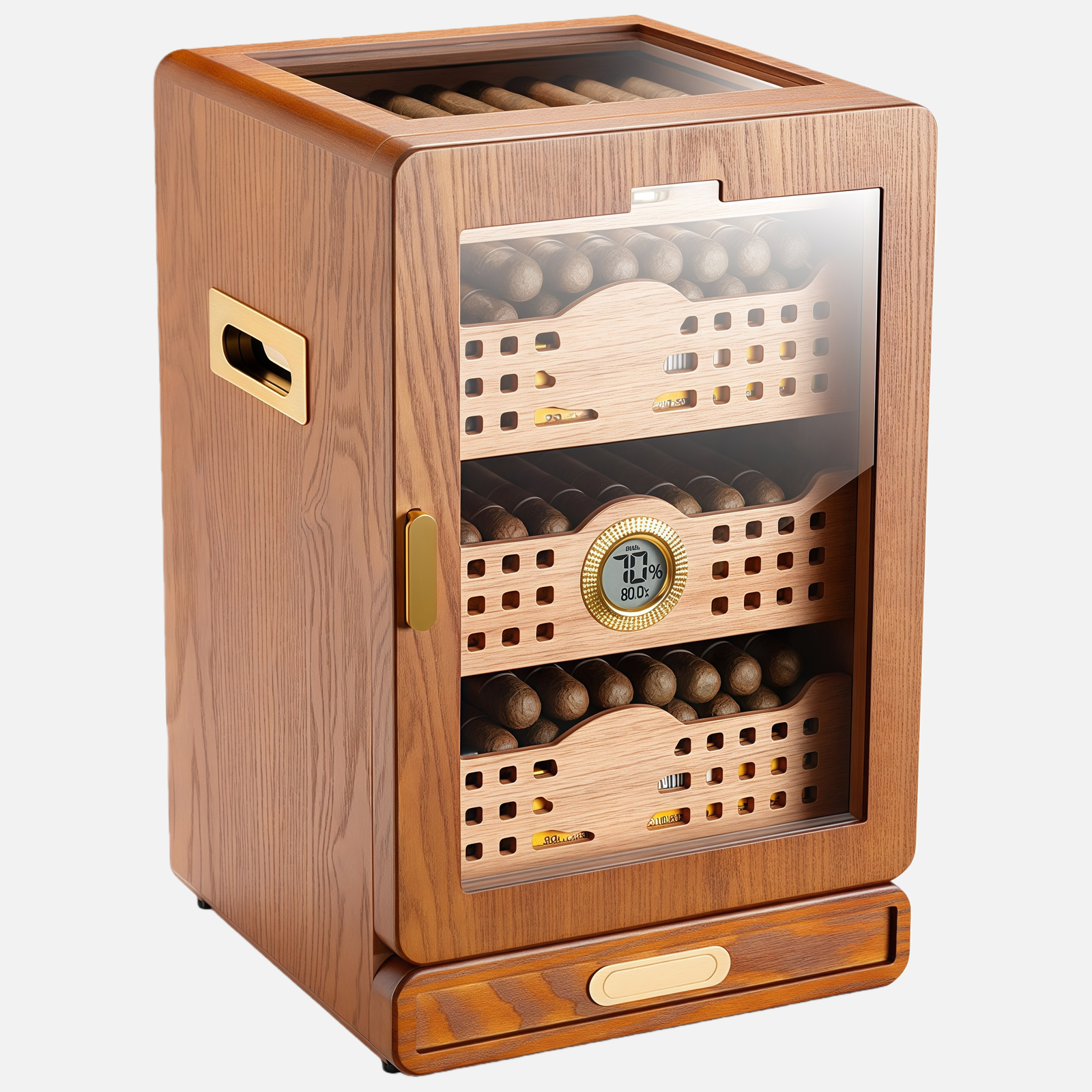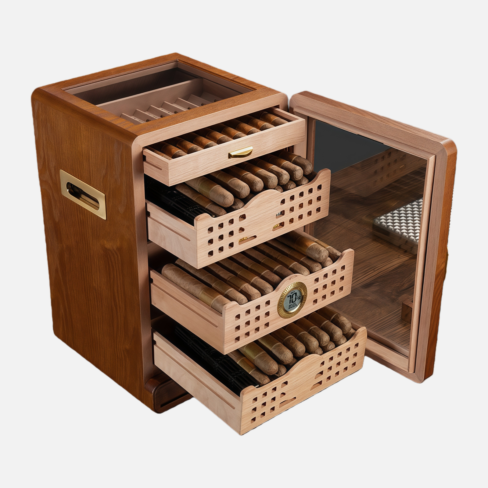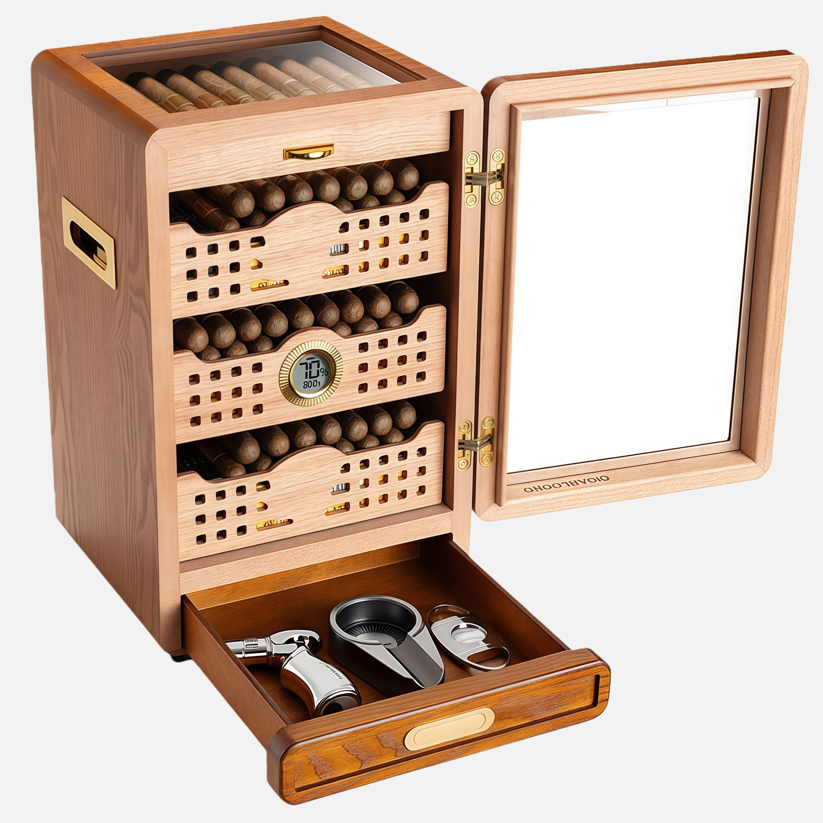 Featuring premium cedarwood shelves, the natural aroma helps maintain optimal humidity and aging, ensuring every cigar develops a rich, balanced flavor. Four large shelves allow organized storage of multiple cigars, while the dedicated accessories drawer keeps tools and cutters neatly arranged. The integrated humidifier provides precise humidity control, preserving cigars in perfect condition over time.